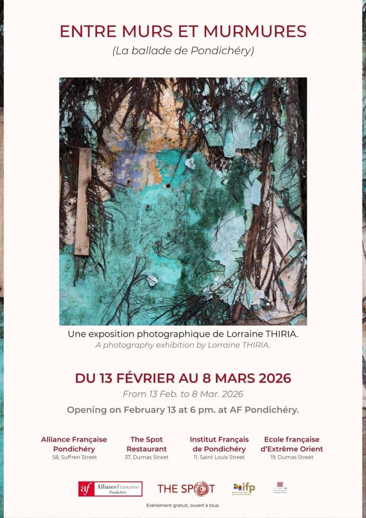 Résidence de recherche et de création artistique sur le sens et l’essence des murs de la ville de Pondichéry (et de leurs mémoires), dans le cadre du Wall Art Festival depuis le 20 janvier 2026, suivie d’expositions photographiques in situ sur les murs de la ville depuis le 13 février et jusqu’au 8 mars 2026. Pour des photographies et textes de la résidence et des expositions : https://lorrainethiria.com/residence-et-expositions-a-pondichery-janvier-mars-2026/