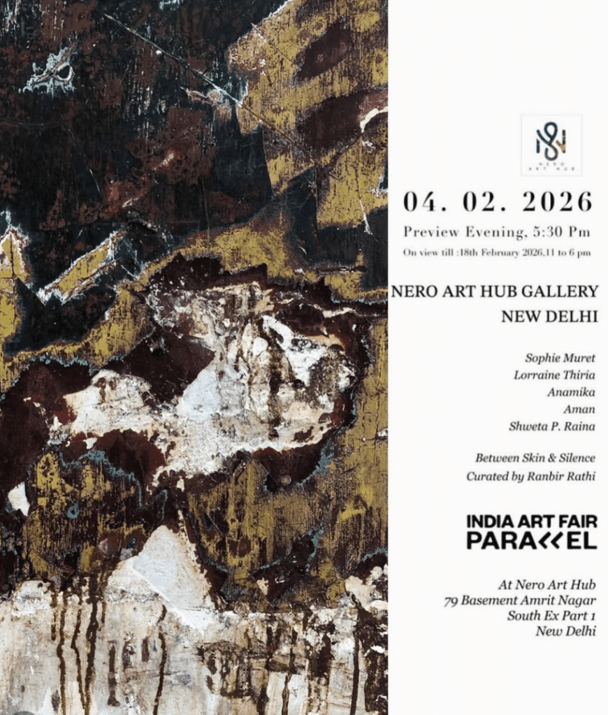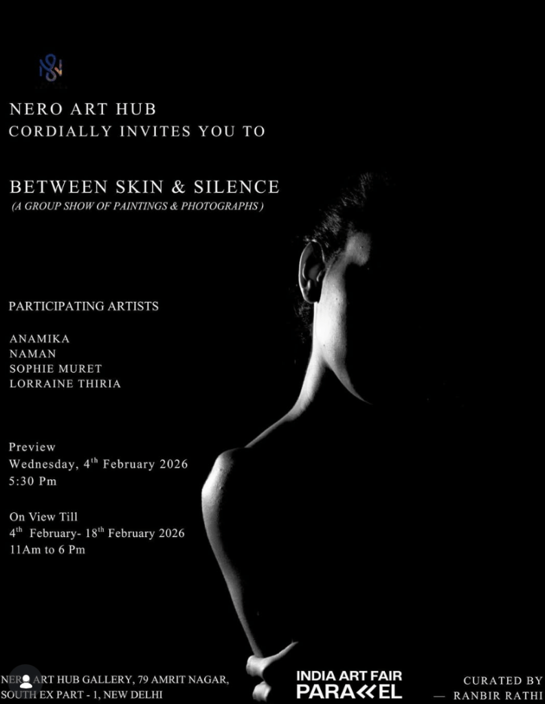 Exposition collective « Between Skin and Silence » à la galerie Nero Art Hub, New Delhi, dans le cadre de l’India Art Fair Parallel 2026. Exposition depuis le 4 février jusqu’au 7 mars 2026 (vernissage le 4 février). Pour plus de précisions sur l’exposition : https://lorrainethiria.com/india-art-fair-parallel-2026-nero-art-hub/