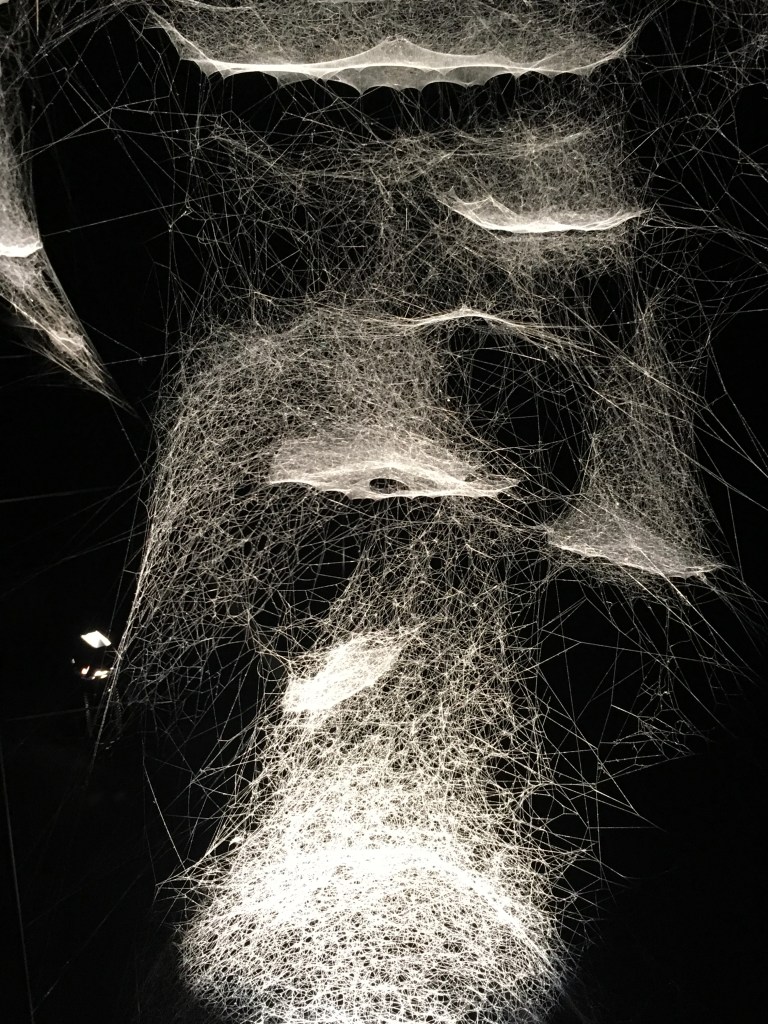 Voir son corps déformé, perturbé par des miroirs infidèles, le sentir liquide, le penser fondant, fondu, fantôme ; se mouvoir dans un espace inconnu découvert au seul son de la musique et des pas feutrés sur les lignes noires et blanches ondulant sur le sol à mesure du passage des corps…