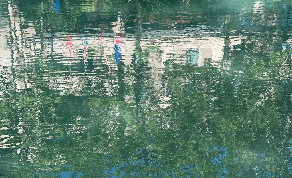 Le cliché des reflets sur l’eau du pont des amoureux d’Annecy (photographie ci-dessus) en est une bonne illustration : de prime abord, vous pensez à une peinture abstraite ; puis creusant le regard, et prenant le soin de reculer de quelques pas, vous vous rendez compte qu’il s’agit d’une peinture figurative de reflets sur l’eau. Vous découvrez des pleins et des vides, des liés et déliés, des aplats et dégradés, des touches colorées flottant sur l’eau et créant le langage pictural.