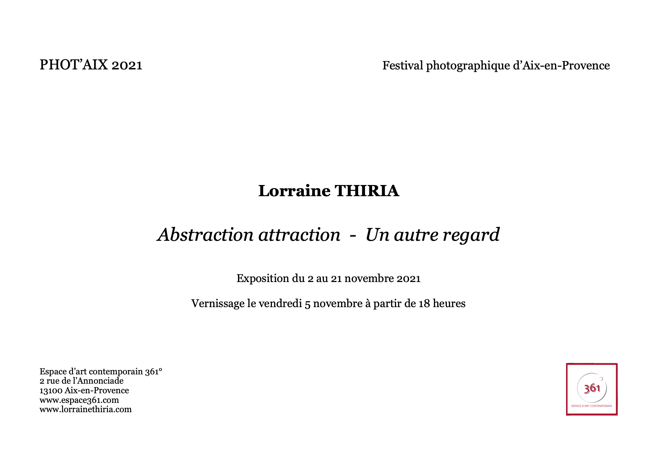 Participation au festival photographique d’Aix-en-Provence du 1er au 20 novembre 2021 au sein de la galerie Espace 361°.