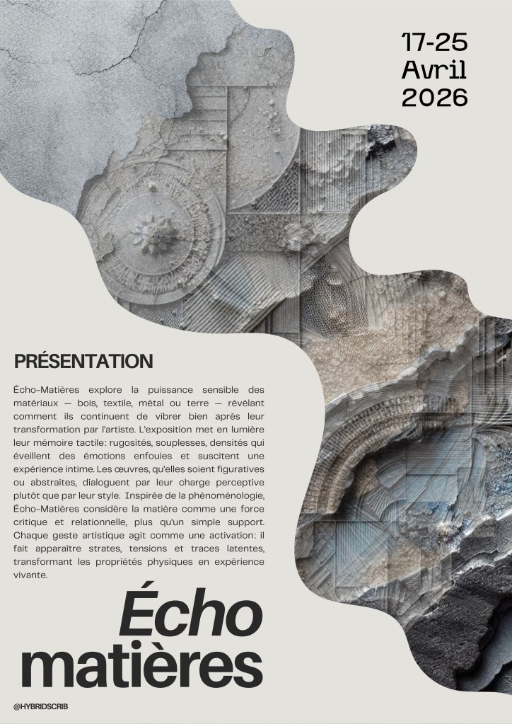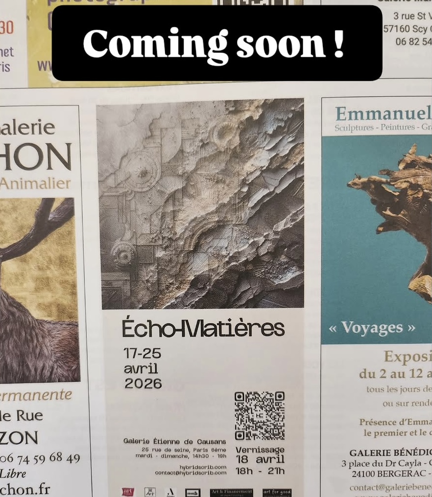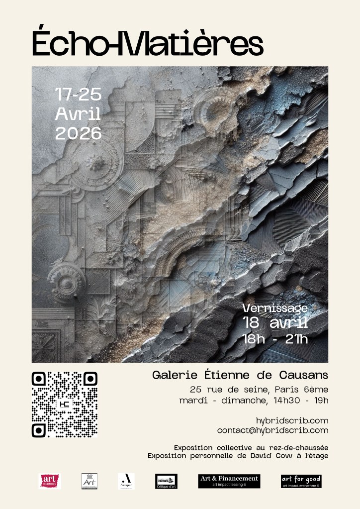 Exposition collective « Echo-Matières » du 17 au 25 avril 2026 curatée par Hybrid’s Crib à la galerie Etienne de Causans, 25 rue de Seine, Paris 6ème. Vernissage le 18 avril à partir de 18 heures.