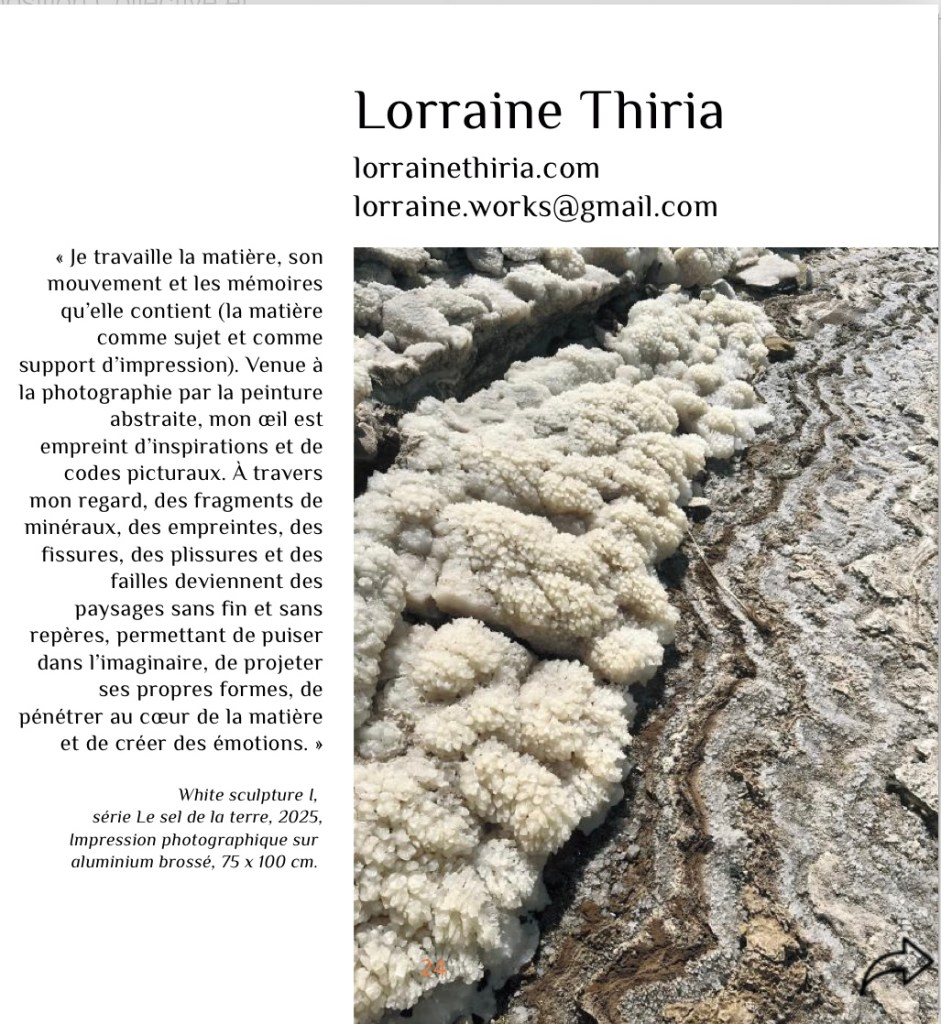 Trois de mes photographies y sont présentées : « Stone Stamps » de la série Requiem for Reqem, « White sculpture I » et « White sculpture III » de la série Le sel de la Terre, dont la première en vitrine de la galerie.