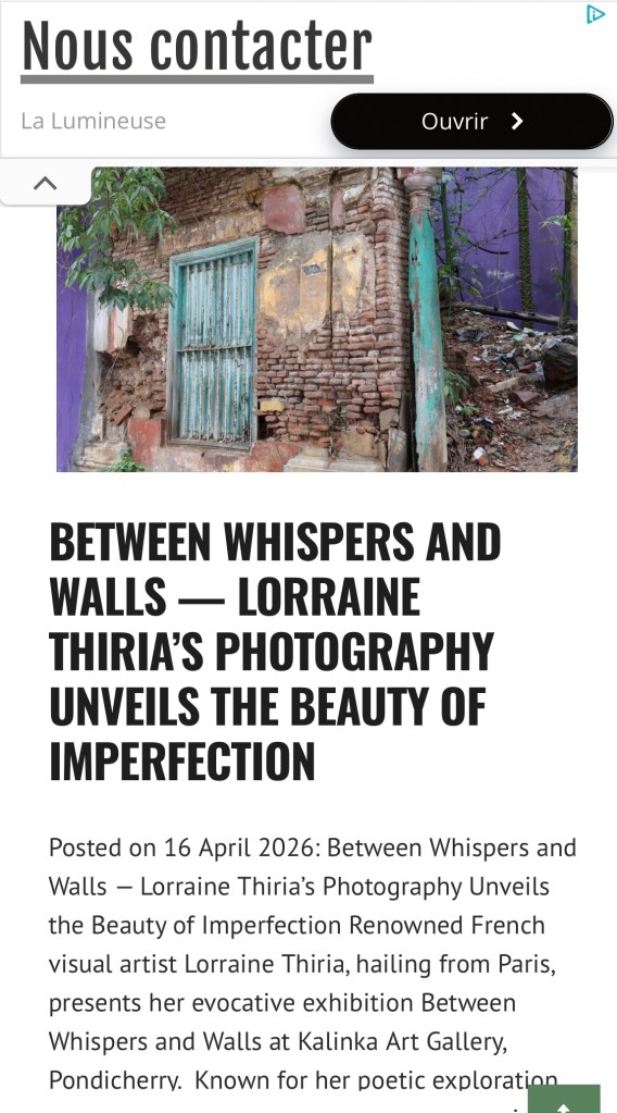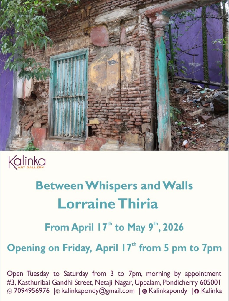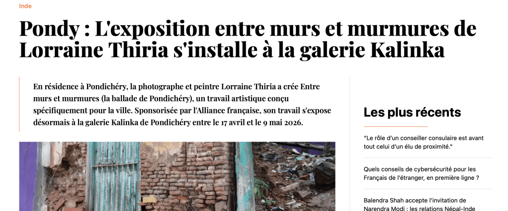 Publication dans le Petit Journal Inde du 16 avril 2026 : https://lepetitjournal.com/inde/agenda/expositions/pondy-l-exposition-entre-murs-et-murmures-de-lorraine-thiria-s-installe-a-la-galerie-kalinka