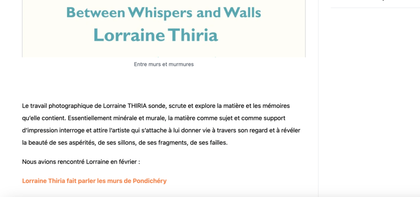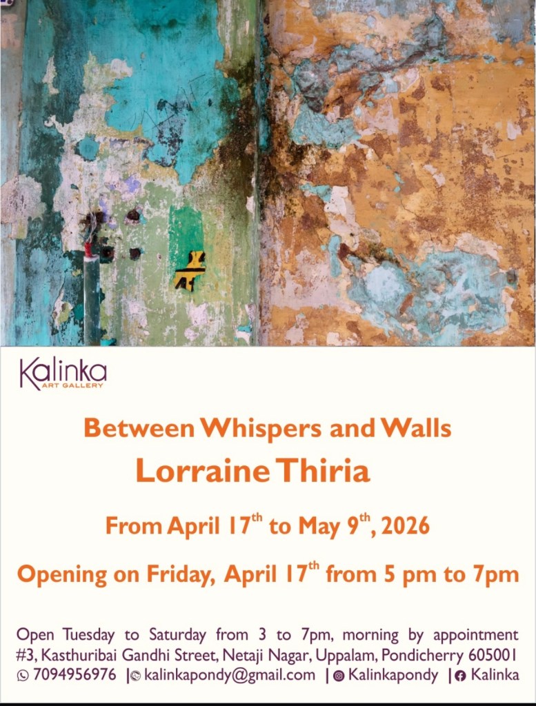 Après une résidence photographique en janvier et février 2026 sur les murs de la ville de Pondichéry en Inde, en collaboration avec l’Alliance Française de Pondichéry, l’exposition « Entre murs et murmures (la balade de Pondichéry) » s’est tenue dans plusieurs lieux de la ville pendant le Wall Art Festival : https://lorrainethiria.com/residence-et-expositions-a-pondichery-janvier-mars-2026/