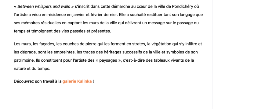 « Between whispers and walls » s’inscrit dans cette démarche au coeur de la ville de Pondichéry où l’artiste a vécu en résidence en janvier et février dernier. Elle a souhaité restituer tant son langage que ses mémoires résiduelles en captant les murs de la ville qui délivrent un message sur le passage du temps et témoignent des vies passées et présentes.