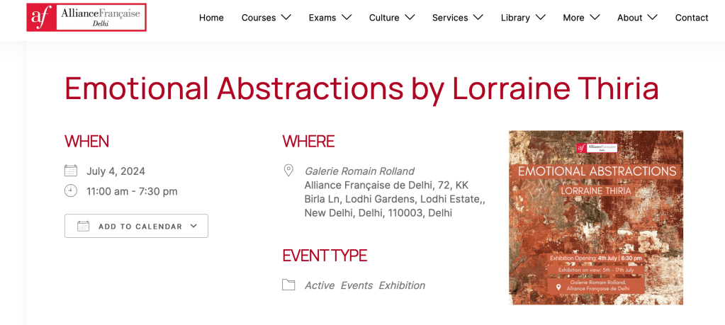 Exposition au sein de la Galerie Romain Rolland de l’Alliance Française de Delhi du 4 au 17 juillet 2024 : « Emotional abstractions », adresse : K.K Birla Lane, 72 Lodi Estate, New Delhi 110003