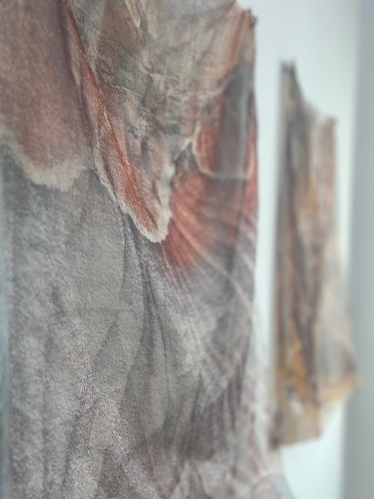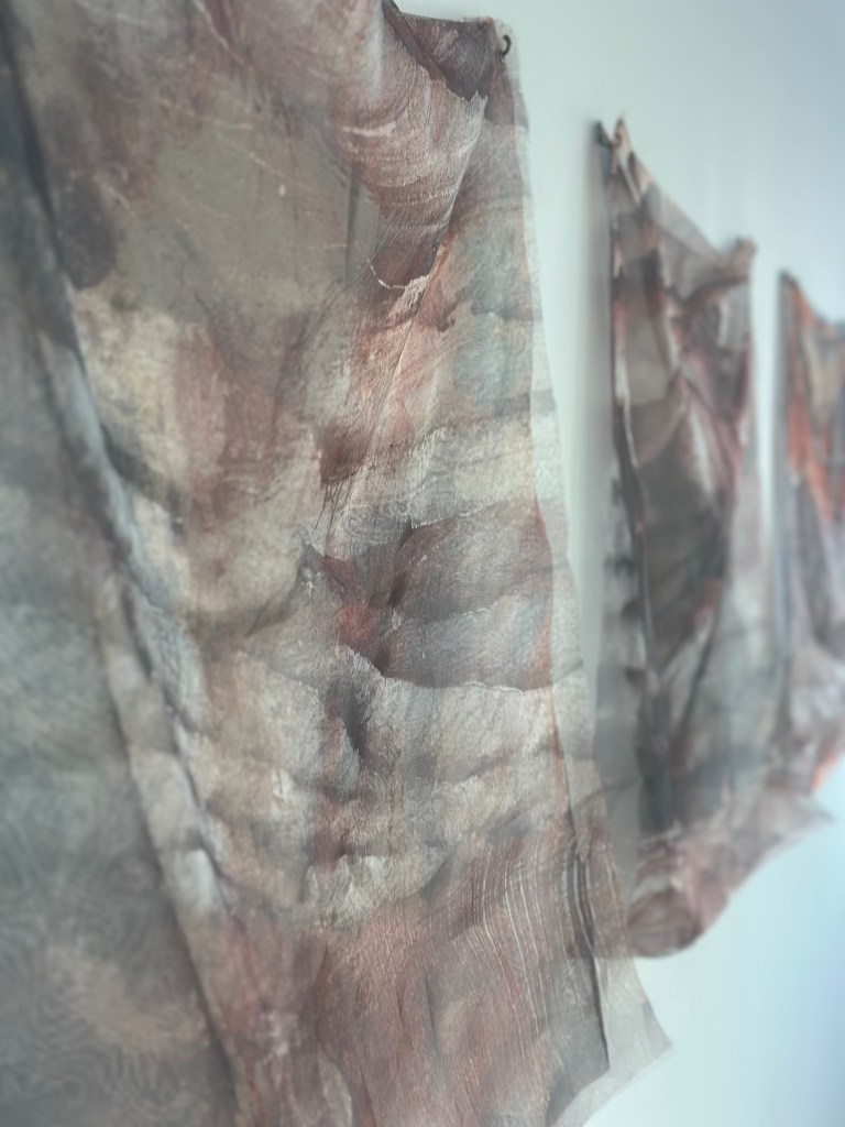 De la même manière, ces peintures sont en partie recouvertes de voiles (sur lesquels les photographies ont été préalablement imprimées), strate sur strate, pour mieux en révéler la matière et les infinies teintes sculptées par l’érosion.
