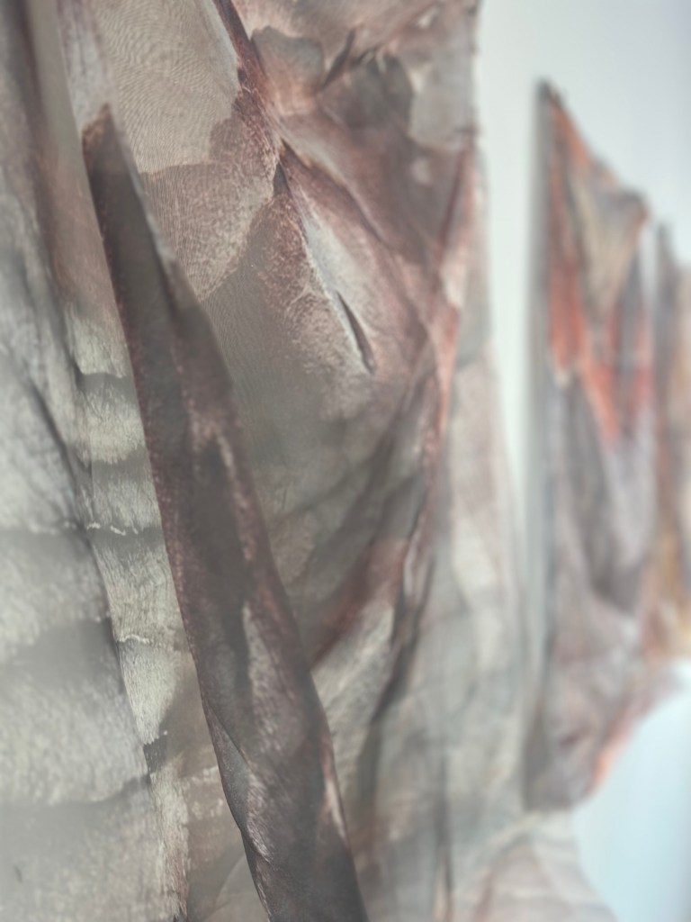 Pour la première fois en effet, mes photographies sont en partie imprimées sur un tissu d’organza, tissu fin, souple, transparent, soyeux, léger, fabriqué à partir de soie, presque évanescent, afin de sculpter la lumière et l’espace et de créer une superposition poétique, presque abstraite, de couches minérales.