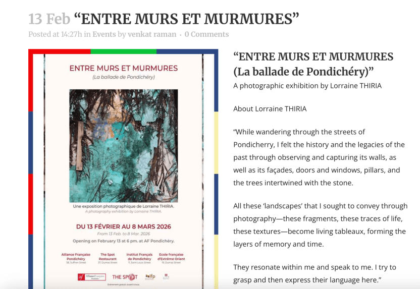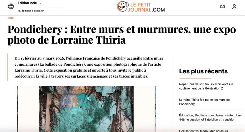 Article sur l’exposition dans le petit journal version Inde : https://lepetitjournal.com/inde/agenda/expositions/pondichery-entre-murs-et-murmures-une-expo-photo-de-lorraine-thiria-