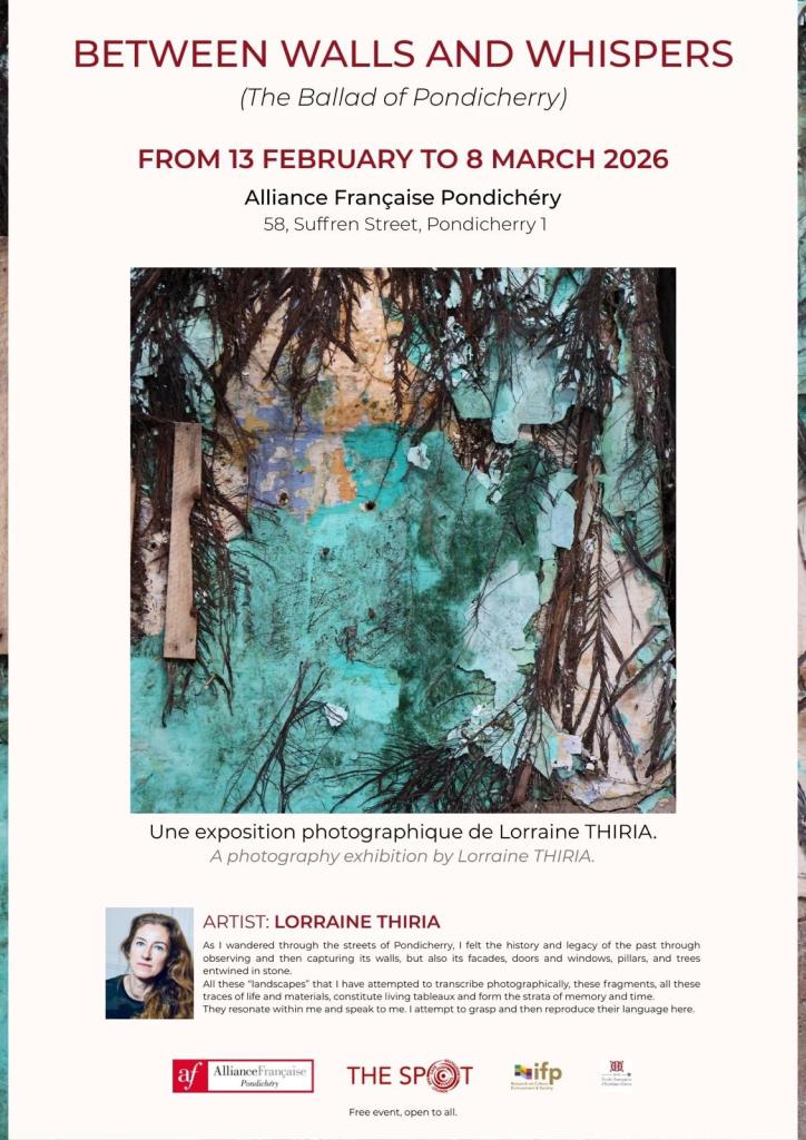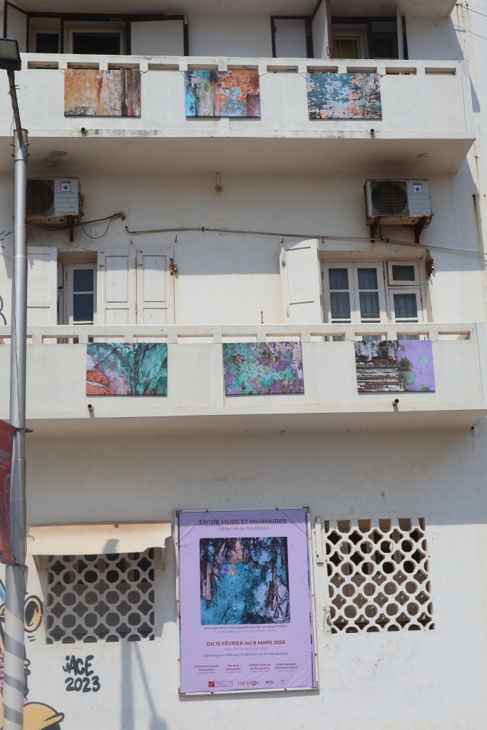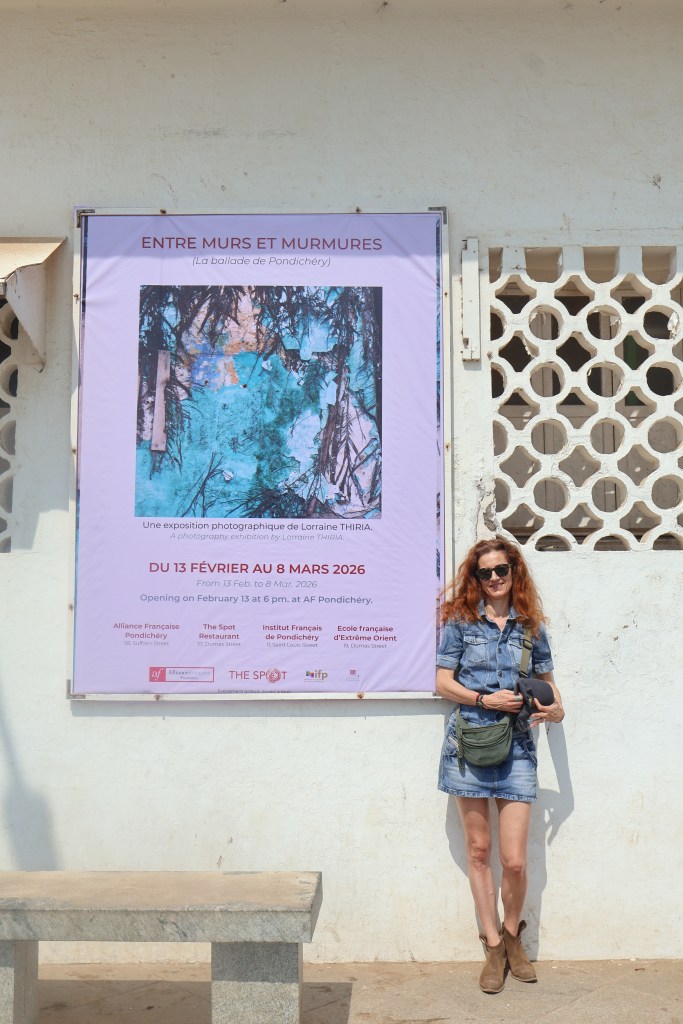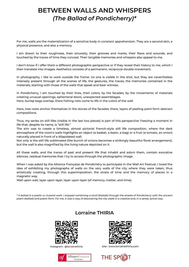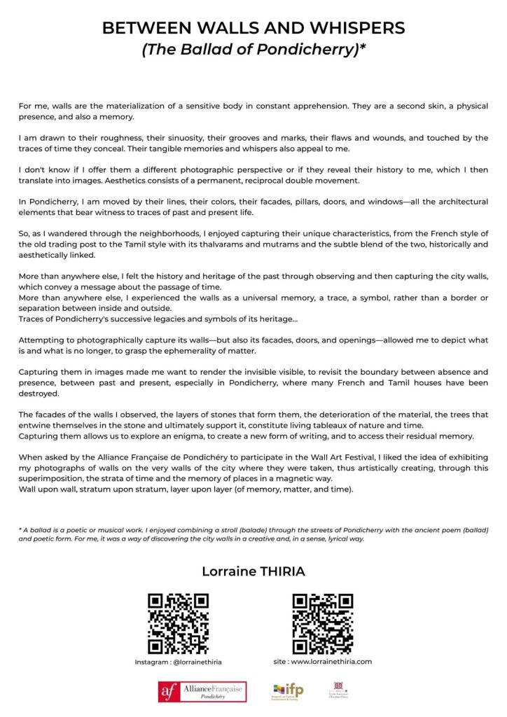 Résidence de recherche et de création artistique sur les murs de la ville : 4 séries photographiques créées sur place à Pondichéry et scénographiées dans 7 lieux différents avec leur complémentarité et leur personnalité ; dès lors des narrations distinctes adaptées aux espaces.