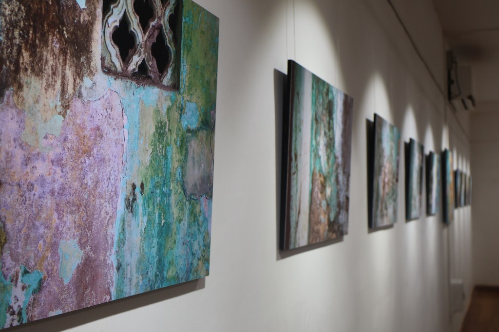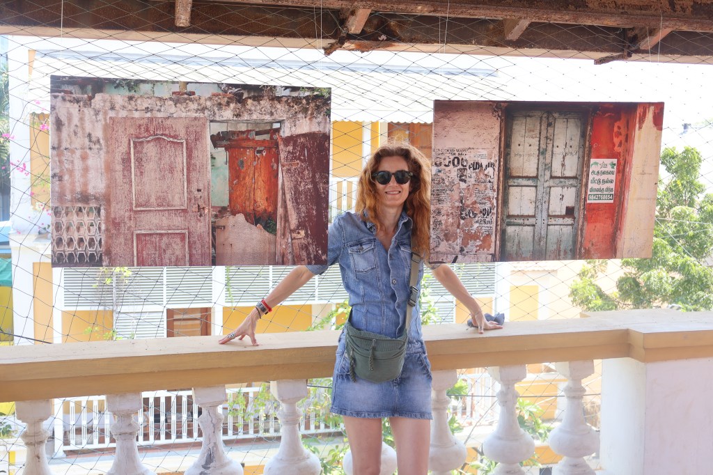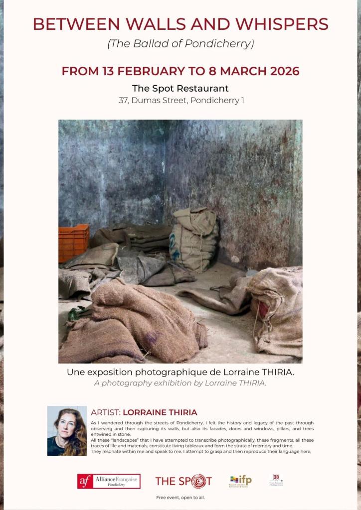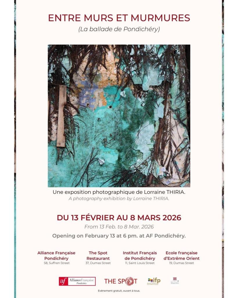 Résidence de recherche et de création artistique sur les murs de la ville : 4 séries photographiques créées sur place à Pondichéry et scénographiées dans 7 lieux différents avec leur complémentarité et leur personnalité ; dès lors des narrations distinctes adaptées aux espaces.